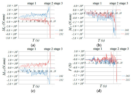 Time history of internal forces of diagonal bar 161and 232: (a) Mx’, (b) My’, (c) Mx’y’, (d) F.