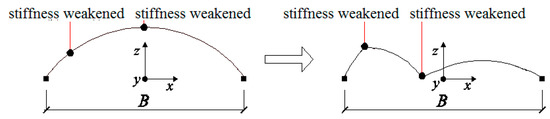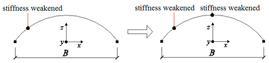 However, Earthquake loading is asymmetric, so plastic deformation and damage accumulation in the dome are also inevitably asymmetric. This means the D value and the increasing speed of the D value of the bars in this zone are larger than those of bars in other zones. With the continuing ground motion and gradually increasing amplitude, 5.13 s later, the center of gravity of the dome moved towards the X direction (Figure 11). This is because plastic deformation occurred due to vibrations, and the overall geometric configuration shifted towards zone 2-2. This phenomenon conversely caused the internal forces of members in zone 2-2/3-3 to become significantly larger than those in the symmetric zone of 11-11/10-10. Consequently, the speed of damage of bars in zone 2-2 was higher than that of bars in the symmetric zone (Figure 4b,c).