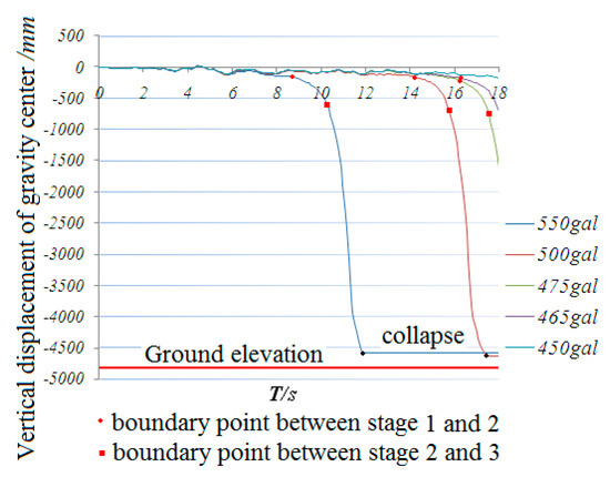 The deformation of the dome changed throughout the whole collapse process; therefore, the center of the structure changed as well. Figure 20 shows the change in the locations of the center of gravity of the structure during the whole collapse process. Different peak ground acceleration values were selected with the same duration of 18 s. It can be seen that the center of gravity decreased with the different PGA values.