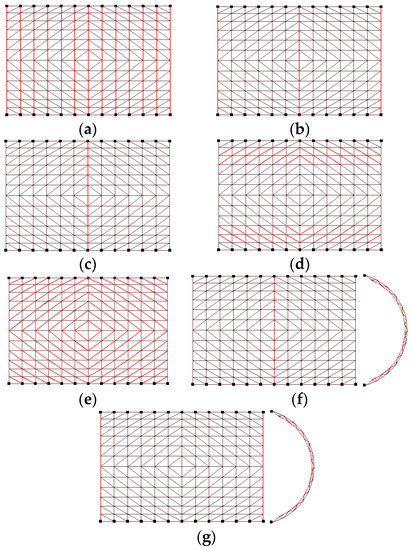 Based on the numerical simulation results, seven mitigation schemes were developed to prevent the collapse of the dome: in Figure 21a, the cross section of all top chords in the transverse direction increased. In Figure 21b, the cross section of three top chords in the transverse direction increased. In Figure 21c, the cross section of the top chords at center was increased. In Figure 21d, the cross section of the diagonal members as shown in the Figure increased. In Figure 21e, the cross section of all the diagonal members increased. In Figure 21f, extra diagonal and bottom cords were added to the arch at the center of the shell. In Figure 21g, extra diagonal and bottom cords were added to the two arches at the end of the shell. All the increased section sizes used the ones specified in GBT17395-1998 [38], with a wall thickness of 6 mm.