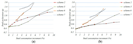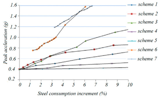 It can be seen that, with the increase in the steel consumption, the collapse peak acceleration, which can be taken as the seismic capacity index of schemes 6 and 7, increases most rapidly. On the other hand, for schemes 2 and 3, the capacity index increases less than in schemes 6 and 7, while in schemes 4 and 5, the capacity index increases the least.