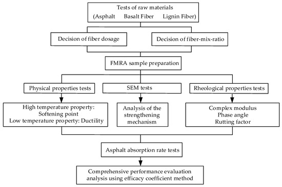 With the rapid development of the modern economy, more and more fibers are being used in scientific research and engineering practice. Using fibers as reinforcements can often have better economic and performance advantages in extending the service life of matrix materials [1,2,3]. In the field of road engineering, many scholars have done a lot of research on the asphalt mixtures reinforced by different fibers, and found that basalt fiber (BF) and lignin fiber (LF) can significantly enhance the performance of asphalt and asphalt mixtures [4,5,6]. As a kind of composite material, the performance of asphalt mixture depends largely on its composition [7]. In asphalt mixtures, fibers are mainly combined with asphalt, and they together play a very important role in the asphalt mixtures. There are some evidences showing that the impact of fiber on asphalt has a good correlation with the impact on asphalt mixture [8,9,10]. Scholars around the world have begun to pay attention to the theoretical study of the performance of fiber-reinforced asphalt mortar [11,12,13].