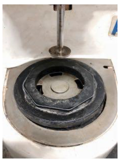 The dynamic shear rheometer used in this paper is produced by Malvern Instruments Co., Ltd., Malvern, UK, as is shown in Figure 4. According to ASTM D7175 [27], the diameters of the parallel plates (Figure 5) are 25 mm, and the gap value is set as 1000 μm. The strain-controlled loading mode is adopted in this paper, and the controlled strain was set as 1%. The test samples were placed between these two parallel plates. During the test, the lower plate remains fixed and the upper plate continuously swings back and forth around the central axis. It is obvious that the driving loads on asphalt pavement is dynamic, so the dynamic shear frequency is closely related to the traffic volume of the pavement. For example, high frequency can simulate heavy traffic or high speed, and low frequency can simulate light traffic. Therefore, in order to make the tests more similar to the actual situation, the complex modulus (G*), phase angle (δ), and rutting factor (G*/sin δ) of MFRA were tested at 60 °C with different test frequencies.