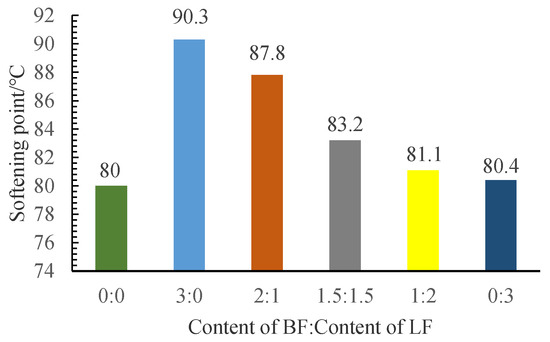 It can be seen from Figure 8 that the fiber mix ratio (FMR) has a great influence on the increase of the softening point. By comparison and calculation, the softening point of asphalt with 3% BF (FMR is 3:0) increased by 12.9% compared with that without fiber. In the previous analysis of the macroscopic and microscopic morphology of BF, it is clear that BF is not easy to agglomerate. Therefore, BF can disperse more evenly in the SBS asphalt and form a three-dimensional network structure [28,31], which could make the MFRA more stable and hinder the flow of asphalt to some extent and eventually make the softening point higher.