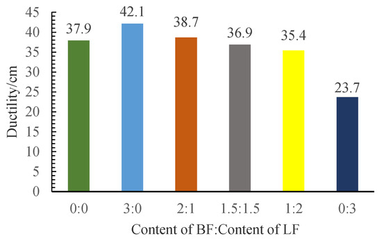According to Figure 9, 3% basalt fiber can significantly improve the low-temperature ductility of SBS-modified asphalt. After calculation, the ductility of it increased by 11.1% compared with the asphalt without fiber. The results are in accordance with the test results of softening point. As is shown in Table 2, the fracture strength and the elasticity modulus of BF is much better than LF. Then, BF could participate more in the test process than LF and disperse some part of the stress [28], and this could lead to the increase of ductility. This is also in accordance with the findings that BF can enhance the stiffness capacity of asphalt [31].