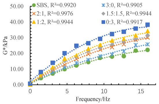 It can also be concluded that G* is positively correlated with the loading frequency. This is because that asphalt is a kind of viscoelastic material. The decrease of the loading time will make the deformation of asphalt smaller, which will eventually lead to the increase of modulus in the test. Besides, FMR has more of an impact on the G* when the frequency is bigger, meaning that when the designed traffic volume is bigger, FMR should be paid more attention in the design of the mixed fiber-reinforced asphalt mixture.