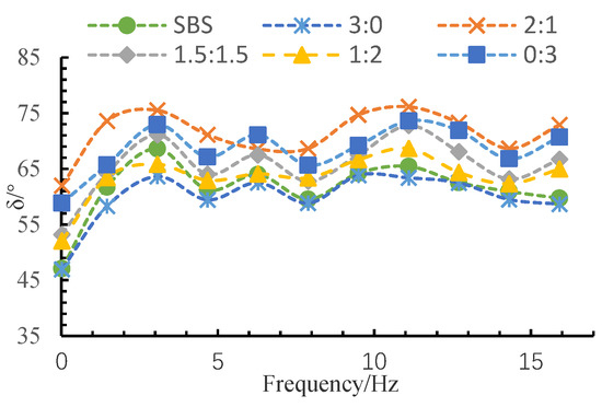 As is shown in Figure 11, the phase angle fluctuates with the increase of frequency but the fluctuation range is limited, which is mainly because of the significant delayed effect of MFRA. Furthermore, the fluctuation phenomenon is in accordance with the test results given by Gu [4]. When the FMR is 2:1, 0:3, 1.5:1.5, 1:2, and 3:0, the phase angle of MFRA decreases in turn. When the fibers are all BF (FMR is 3:0), the phase angle is the smallest, which means that the elastic property is the best. This is mainly due to the high elastic modulus of BF. According to the mechanical principle of composite materials, the overall elasticity composite material is decided by the elasticity of its composition. So, the high elastic modulus of BF will definitely increase the elastic modulus of MFRA.