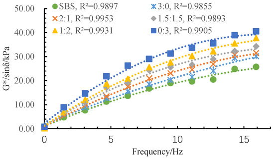 The complex modulus (G*) can be divided into two parts: elasticity and viscosity. A larger G* value represents the greater stiffness and the deformation resistance of asphalt. Phase angle (δ) can stand for the time lag between the stress and the strain in the test. A lower phase angle means better elasticity. The rutting factor (G*/sin δ) can be used to access the high-temperature stability of asphalt, and a higher rutting factor implies better rutting resistance. The test results of the rheological properties of the MFRA under different fiber mix ratios are shown in Figure 10, Figure 11 and Figure 12.