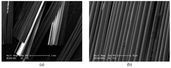 The micro images of basalt fibers are shown in Figure 13. From the micro image, the shape of a single basalt fiber is similar to that of a cylinder, and it has a smooth surface. The diameter and the thickness are very uniform, which will contribute to the stability of BF. There are some little bulges on the surface of basalt fiber, which is mainly caused by the high temperature [19] during its production.