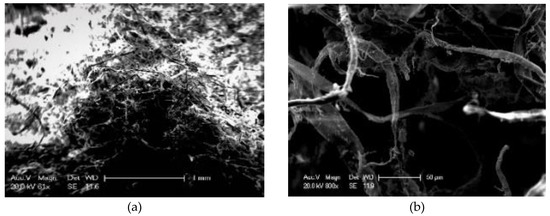Lignin fiber (LF) is made from natural wood. Various application requirements can be obtained via a series of chemical treatments to LF [20], during which the functional groups on the molecular structure of lignin changed. LF is flocculent, it tends to agglomerate and absorb moisture, so it is not suitable to be stacked for a long time in spite of its good chemical stability. The LF used in this paper is produced by The JRS company of Germany, Rosenberg, Germany. The macro image of it is shown in Figure 2. It can be seen from the macro image that the micro morphology of LF is quite different from that of BF. LF is flocculent and it is similar to cotton. Its color is gray and it is easy to be stuck together.