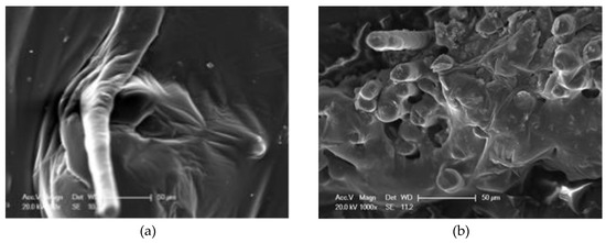 From Figure 16a, there are a lot of folds on the interface layer between LF and asphalt. This is mainly because that LF is very soft and it could curl and contact with asphalt, which will absorb more asphalt on the interface layer. According to Figure 16b and Figure 4, different shapes of lignin fibers could interweave with each other and form a mechanical riveting structure, and this structure could strengthen the properties of the asphalt.