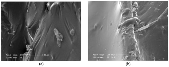 SEM was used to observe the micro morphologies of mixed fiber-reinforced asphalts (MFRA) with three different fiber mix ratios (FMRs): 3:0, 1.5:1.5 and 0:3. The micro images of these three kinds of MFRAs are shown in Figure 15, Figure 16 and Figure 17. According to the SEM images and composite interface theories, it shows that there is an interface layer between the fiber and asphalt, and this could make the fiber bond with the asphalt better. The property of the interface layer is decided by the properties of asphalt and fiber, and it will eventually affect the performance of the fiber–asphalt composite material.