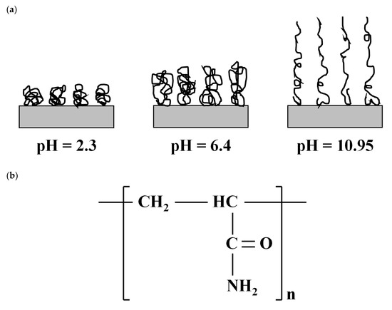 Nonionic polyacrylamide (PAM): (a) schematic drawing of the conformational state of adsorbed PAM at different pH conditions (after [31]) and (b) chemical structure of PAM (after [33]).