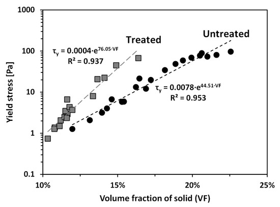 where Vsoilds is volume of solid, Vtotal is total volume, w is water content, and Gs is specific gravity. As shown in Figure 4, τy for the treated clay was higher than that for the untreated clay at a given VF, reflecting the clear impact of PAM on the rheological behavior of the tested bentonite. It can also be observed in Figure 4, that τy of both untreated and treated clays exponentially increases with increasing VF; thus, τy of both clays are proportional to VF in a semi-logarithmic plot.