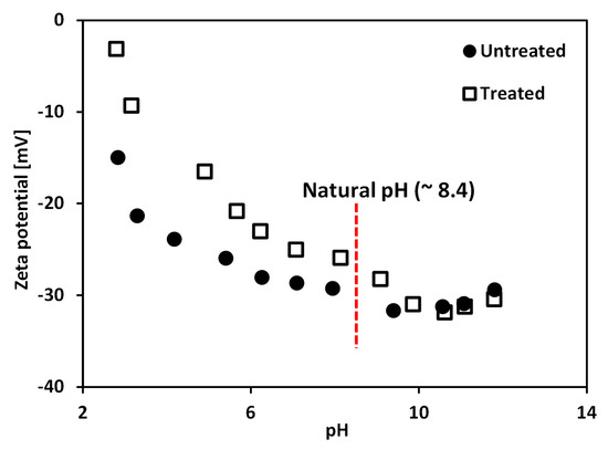 Variations of zeta potential of treated and untreated clays as a function of pH. Note zeta potential was measured using zeta potential analyzer (Otsuka Electronics, ELSZ-1000, Osaka, Japan) with the sample of 0.6 g of dry soil dispersed in 1 L of 0.01 M NaCl solution.