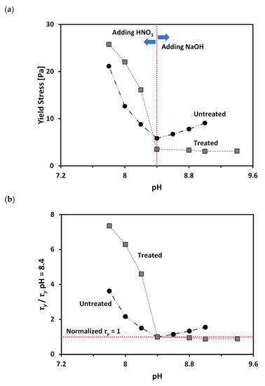 Figure 6a shows variation of yield stress (τy) as a function of pH for the treated and untreated clays at volume fractions of solid (VF), of 11.5% and 15.3%, respectively. Note that the selected VF values for the two tested materials are based on the similar τy at a pH of 8.4 (natural pH without adding pH adjusting agent), as shown in Figure 6a. Figure 6a clearly demonstrates that τy values of both untreated and treated clays increases as pH decreases. The microstructure of bentonite clay tends to form a flocculated structure (i.e., increasing edge (+)/face (−) interaction) with decreasing pH [18,20]. As the strength of a flocculated structure is higher than that of a dispersed structure [9,20,47], an increase in τy with decreasing pH is expected. In contrast, when the pH increases, the microstructure of bentonite clay tends to form a dispersed structure (i.e., increasing face (−)/face (−) interaction), resulting in a decrease in τy.