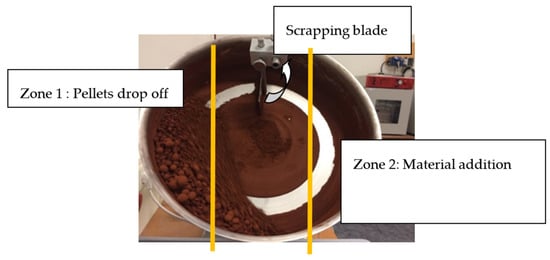 The values for the parameters in LWA manufacturing such as the diameter, the slope angle, and the speed of the rotating pan, were chosen based on previous research by Baykal [25]. The pan granulator (EIRICH, TR04, Hardheim, Germany) had a diameter of 80 cm, the slope of the pan was set to 48°, and the speed of 60 rpm was applied.