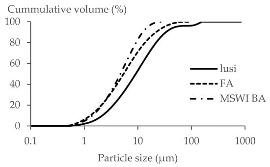 Figure 2 displays the particle size distribution (PSD) of all the powders (FA, Lusi, and MSWI BA, (Indaver, Mechelen, Belgium)). It can be seen that FA and MSWI BA had a very similar size distribution, while the PSD curve of Lusi indicates that it contained a higher content of large particles (Figure 2). The d50 of Lusi, FA, and MSWI BA was 10.5 µm, 6.2 µm, and 5.4 µm, respectively (Figure 2). The surface area of Lusi, FA, and MSWI BA was 0.51 m2/g, 0.83 m2/g, and 0.65 m2/g, respectively.