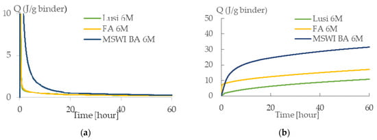 Based on the heat evolution shown in Figure 4, it can be seen that all of the LWA had low reactivity, indicated by the absence of a significant heat flow after the initial mixing. The cumulative heat of all LWA was also quite low, with MSWI BA 6 M releasing the highest heat followed by FA 6 M and Lusi 6 M. The total released heat of MSWI BA 6 M, FA 6 M, and Lusi 6 M amounted to 40.47 J/g, 25.97 J/g, and 19.03 J/g, respectively. This result was also influenced by the different average particle size of the three materials. The total heat released was inversely proportional to the particle size of the raw material.