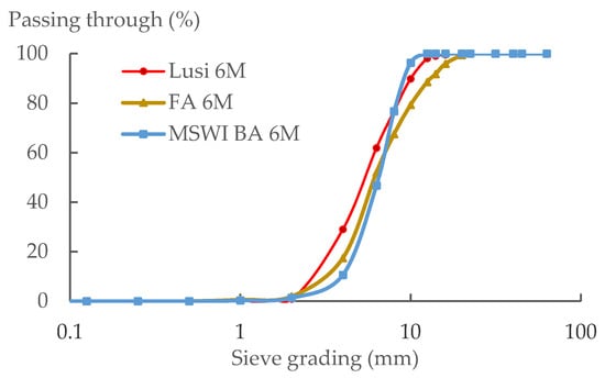 Figure 5 shows that all specimens had a very small content of fine particles of less than 2 mm. Lusi 6 M had the least steep curve, and a higher fraction of fine particles compared to the other LWAs. According to NBN EN 12620, the Lusi 6 M and MSWI BA 6 M LWA meet the requirements for the 2/8 fraction, while FA 6 M has a fraction of 2/10. Thus, it can be noted that the types of raw materials did not affect the particle size distribution of LWA in any significant way. Based on the literature, it is mainly the setup of the pan granulator such as the slope degree, the speed, and the duration of pelletizing that affect the particle size of the resulting LWA [25].