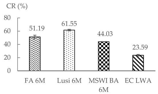 Due to the different standard that was used, the CR value of the LWA in this research could only be compared with the limited results on LWA in the literature. Compared to crushed LWA generated from bottom ash and from limestone in the literature, the CR value of LWA in this research was quite similar to limestone aggregate [38]. Furthermore, the fact that the LWAs produced in this study had a similar CR value compared to those LWAs in the literature is quite promising, considering that the former had a much lower density and higher water absorption than the latter.