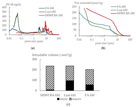 The porosity in the LWA samples can be categorized into two groups: MSWI based on their size range, mesopores (2–50 nm), and macropores (larger than 50 nm) [39]. As shown in Figure 8c, MSWI BA 6 M had the lowest volume of mesopores followed by FA 6 M and Lusi 6 M. The relative volumes of mesopores in MSWI BA 6 M, FA 6 M, and Lusi 6 M were, respectively, 3.48%, 28.03%, and 40.31% of the total porosity.