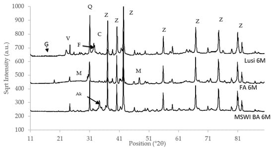 The mineralogy of raw materials shows that Lusi had the lowest amorphous content, followed by MSWI BA and FA (Table 4). The amount of amorphous phase in MSWI BA was quite high, but this value was similar to the value reported earlier for fresh MSWI BA obtained from the Belgian incinerator, being 73% [28]. The major crystalline phases were quartz, mullite, and calcite. Lusi had the highest quartz content followed by MSWI BA and FA, while calcite was only detected in MSWI BA and Lusi.