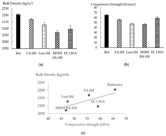 (a) Bulk density, (b) Compressive strength, (c) Correlation between compressive strength and bulk density of mortar containing LWA.