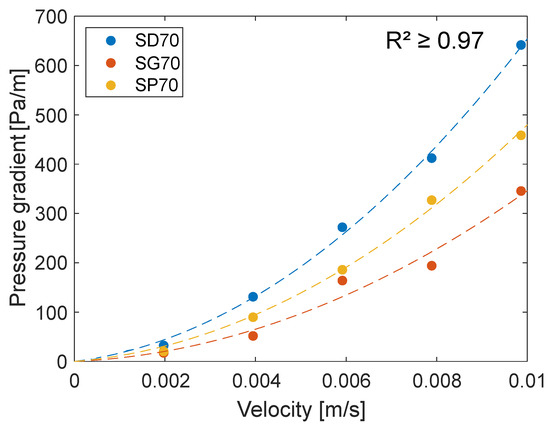 In the commented article, perfusion experiments were performed in a range of flow rates corresponding to non-Darcy flow conditions (). The reported permeabilities, evaluated with Darcy’s law, differed as the flow rate changes (Figure 4 in [1]), demonstrating the invalidity of Equation (1) in this study. In order to better estimate the permeability of the TPMS samples, the original data were processed using the Forchheimer Equation (2) (Figure 1).