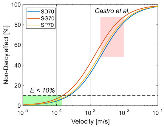 Darcy’s law is an approximation that is valid only in a limited range of low velocities () [2]. In order to describe higher velocity flows (i.e., non-Darcy flows), Forchheimer [3] added in Equation (1) a second term representing kinetic energy due to inertial effects: