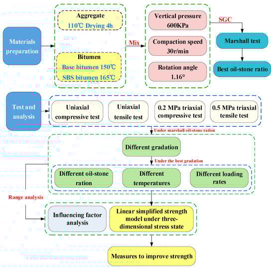 Therefore, this article uses the above method to test the widely used SMA-13 asphalt mixture and establishes a unified three-dimensional strength calculation model that considers the effects of temperature, loading speed, and oil-stone ratio, and analyzes the influence of various factors through orthogonal experiments. The three-dimensional strength control measures are proposed in order to make better use of the strength potential of the asphalt mixture. The research scheme is shown in Figure 1.