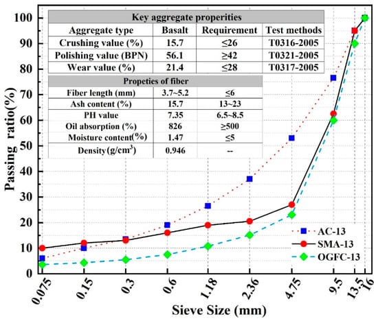 It has been clarified that to study the influence of gradation and asphalt type on the three-dimensional strength of asphalt mixture, the Continuous-dense-graded bituminous mixture AC-13, Gap-dense-graded bituminous mixture SMA-13 and Gap-open-graded bituminous paving mixture OGFC-13 were used in this research, which were widely used in asphalt surface layer. The gradations are shown in Figure 2. In addition, the aggregate type is basalt, the apparent density and mechanical properties are shown in Figure 2 and Table 1. The binder is widely used SBS (Styrene-Butadiene-Styrene Block Copolymer) modified bitumen and 70 # base bitumen, and its properties are shown in Table 2. The wood fiber was used in SMA-13 and OGFC-13asphalt mixture. The fiber content is 0.5%, the basic properties are shown in Figure 2.