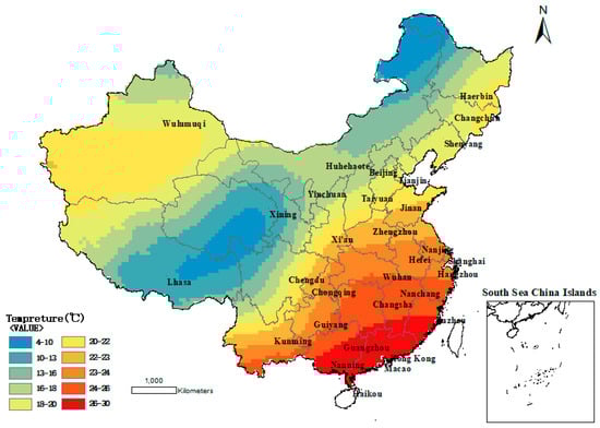 In the Specifications for the design of highway Asphalt pavement (JTG D50-2017), the influence of temperature was emphatically considered in the damage analysis of the reference pavement structure. To consider the influence of temperature, the pavement structure damage under different air temperature conditions is converted to the equivalent damage under standard temperature (20 °C). The equivalent temperature is based on the hottest monthly average temperature, the coldest monthly average temperature, and the annual average temperature for 10 consecutive years in the specification. According to the benchmark equivalent temperature in the specification, the equivalent temperature distribution map of each region in China can be obtained by ArcGIS software using interpolation processing, as shown in Figure 4. Therefore, 5 °C, 10 °C, 15 °C, 20 °C, 25 °C, and 30 °C were selected as the experimental temperatures to better simulate the actual working temperature of the road. The specimens should be placed in the temperature control box for more than 4h before the test to ensure the accuracy of the test temperature.