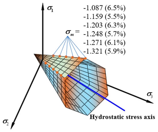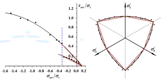 To study the three-dimensional strength characteristics of asphalt mixtures, Huang [25] performed a triaxial failure test on a type of AC-13 asphalt mixture, and established a three-dimensional strength model characterized by tensile and compressive meridian, and failure strength envelope. The strength model which considering the cooperative destruction between each component is shown in Equation (1). However, the model is a complex nonlinear model due to contains five parameters and the form is complicated, which is not convenient for popularization and application.