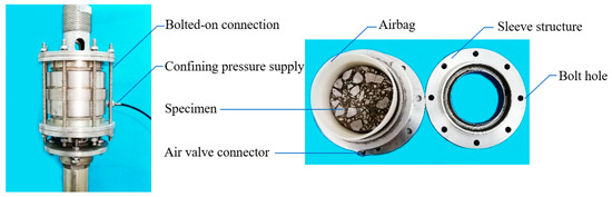 It is known that the linear strength model can be obtained through uniaxial compressive, direct tensile and triaxial compressive tests. Before performing the direct/triaxial tensile test, clean the upper and lower contact surfaces of the pull plate and the test specimen and apply the adhesive, wait for the adhesive to fully cure, and then apply axial tensile stress to the test specimen until destroy the specimen. Through the self-developed airbag triaxial tester [25] to carry out the triaxial compression/tension test, as shown in Figure 6. Through the flexible airbag to apply the same compressive stress and ( and ) in the horizontal direction, we then apply the axial compressive stress () to cause the failure of the specimen [27]. Before performing the uniaxial and triaxial compression tests, the upper and lower pressing plates and the specimen surface were wiped with Vaseline, and a cushion was added to reduce the friction between the specimen and the pressing plate. In addition, before the triaxial test, the inner wall of the airbag and the contact surface of the specimen should be rubbed with lubricating oil to lubricate the inner wall.