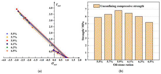 Linear compressive and tensile meridian under different oil-stone ratios. (a) The compressive and tensile meridian under six different oil-stone ratios (b) The strength comparison between six different oil-stone ratios.