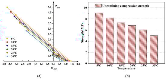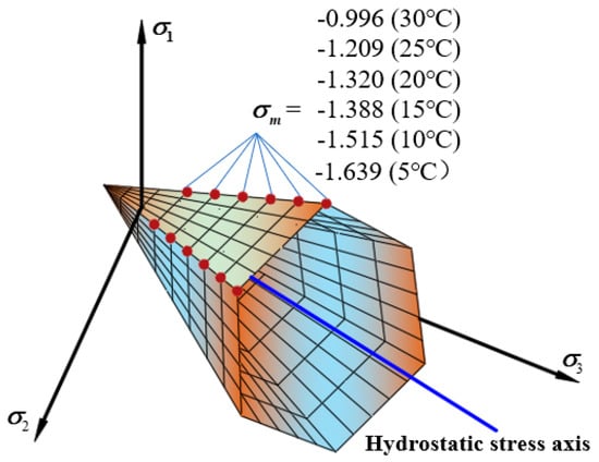 Figure 10 shows the linear compressive and tensile meridians under different temperatures. The octahedral tensile and compressive strength of the asphalt mixture decreases with increasing temperature. Uniaxial compressive strength exhibits a linear characteristic with temperature. From 5 °C to 30 °C, the uniaxial compressive strength of the mixture decreased by 40%. The change in temperature makes the asphalt molecules flow faster, and the contact angle between the asphalt and the aggregate becomes smaller [15], which in turn makes the asphalt mixture show a decrease in strength; the performance is reduced due to the high-temperature dependence of the mixture will continue. Selecting asphalt with better temperature stability can effectively maintain long-term service of asphalt pavement. The failure envelope under different temperatures in plane is shown in Figure 11.