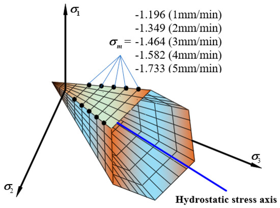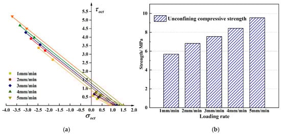 Figure 12 shows the tensile and compressive meridian under different loading rates. The results show in the test loading rates range, as the loading rate increased, the tensile and compressive strengths showed an increasing trend. From 1 mm/min to 5 mm/min, the uniaxial compressive strength increased by 68%. The change of the loading rate is the change of the loading time. When the loading rate increases, the time from when the asphalt mixture starts to crack to the failure of the specimen gradually decreases. The asphalt mixture cannot show a complete mechanical response [32], so it shows a reduction in deformation and the strength increases. The failure envelope under different loading rates in plane is shown in Figure 13.