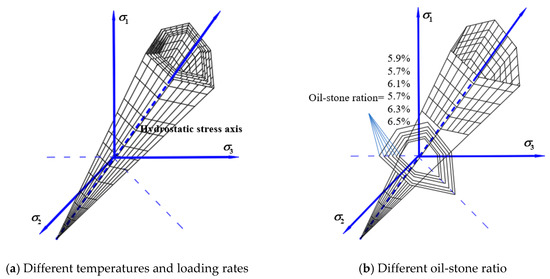 The change law of linearized three-dimensional failure envelope surface can be obtained with the temperatures, loading rates, and the oil-stone ratios. Figure 14 shows the linear failure criterion in the space. The middle symmetry axis in the three-dimensional failure envelope surface is the hydrostatic stress axis as shown in Figure 14, the compressive meridian is composed of all points of the lodes angle 60°, and the tensile meridian is composed of all points of the lode angle 0°. From the above, in the temperatures range of 5 °C~30 °C and the loading rates range of 1 mm/min~5 mm/min, the three-dimensional basic strength of the asphalt mixture changes linearly with the test conditions. As the temperature increases, the enveloping surface of the asphalt mixture failure shrinks continuously, and as the loading rate increases, the enveloping surface continues to expand until the strength limit is reached. The change of the three-dimensional failure envelope surface with the oil-stone ratio is a kind of non-linearity parabolic form, and the envelope surface appears to expand first and then contract.