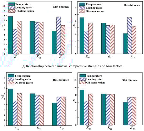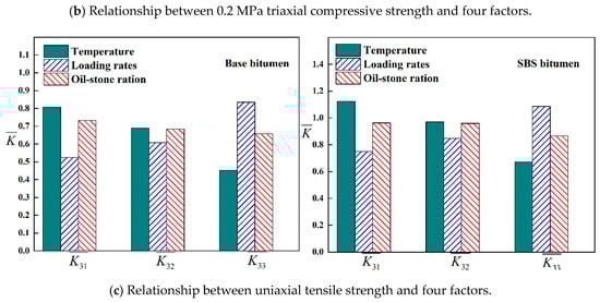 It can be seen from Table 13 and Figure 15 that the greatest influence on the strength of the mixture is the asphalt type, the second most influence is the temperature, the less influence is the loading rate, and the least influence is the oil-stone ratio. This is because compared with matrix asphalt, SBS modified asphalt has a higher flexibility index [19], penetration and ductility are higher than Base asphalt, which improves the adhesion between asphalt and aggregate. As the temperature increases or the loading rate decreases, the strength of the mixture gradually decreases, which is mainly caused by the accelerated flow of the asphalt molecules and the decrease in the contact angle between the asphalt and the aggregate.