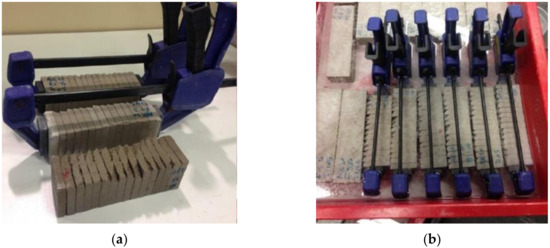 In order to investigate the self-healing process of materials containing SCMs, the reaction products formed in artificial cracks were characterized and the amount of healing products was quantified. A special procedure was followed [7]: an artificial planar gap was made by cutting the 40 × 40 × 160 mm3 sample into 16 slices, each slice having a thickness of around 10 mm. After that, the slices were pressed together by using a plastic clamp to obtain a crack width of less than 150 µm. The specimens were then cured in tap water for various healing times (Figure 1). By using tap water, the simulation was closer to reality and avoided the leaching of healing products. Similarly to the healing process occurring in real cracks, new reaction products were precipitated inside the artificial planar gaps between two slices.