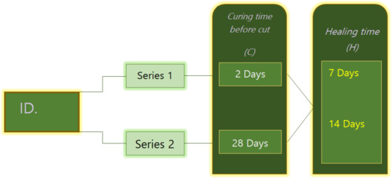 For each mortar mixture mentioned before, two series of specimen were prepared. As shown in Figure 2, series 1 specimens were artificially cracked after two days of curing, while series 2 specimens were cracked after 28 days of curing. To evaluate the influence of the healing period, the specimens prepared in every series were subjected to 7, 14, and 28 days of healing. For instance, mixture MK20–BFS10 2C8-28H was cracked at 28 days and then subjected to 28 days of healing.
