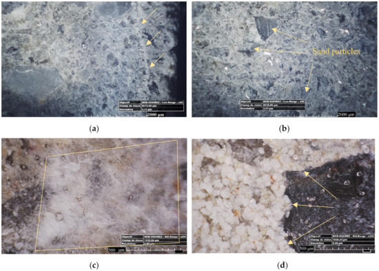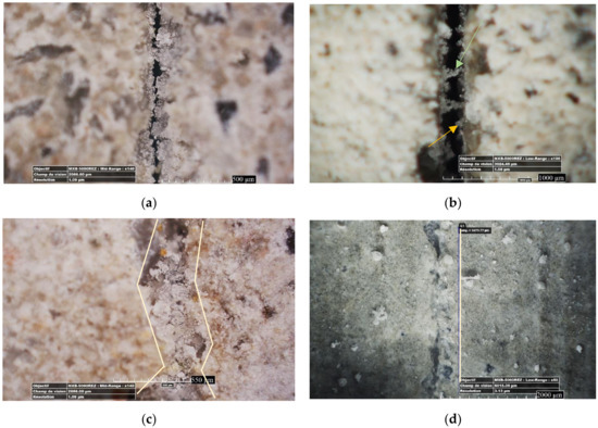 Observing internal crack surfaces with an optical microscope and focusing on different morphologies and their position revealed some interesting information. Figure 3a shows pictures of the internal crack surfaces from crack edges to center. The crystals that were formed near the crack mouth (a distance of around 1200–1400 μm to the crack lips) were mostly composed of non-dense crystals that were calcite precipitates [8]. Then, further inside the crack, these crystals became denser (as is shown by a yellow arrow in Figure 3a) and cabbage-like crystals that could be C-S-H compounds were observed [13]. Moving toward the center, the healing products were more gel-like. Finally at the center, the healing products were crystal-like and condensed on most of the cases.