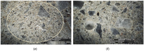 During the self-healing period, the former planar crack surfaces were covered by a layer of precipitates. Different types of morphologies that can be classified into two major groups were detected: the crystal-like precipitates and the gel-like precipitates, both of them corresponding well with previous results [13]. The crystals had similar forms for all formulations. As illustrated in Figure 3, crystal-like precipitates could be classified in cabbage-like (Figure 3d), needle-like (Figure 3e), and irregular-shape (Figure 3f) types. The cabbage-like crystals were found to be more condensed, thus leading to a greater filling percentage of the cracks. Conversely, the crack filling percentage due to needle-like products was smaller.