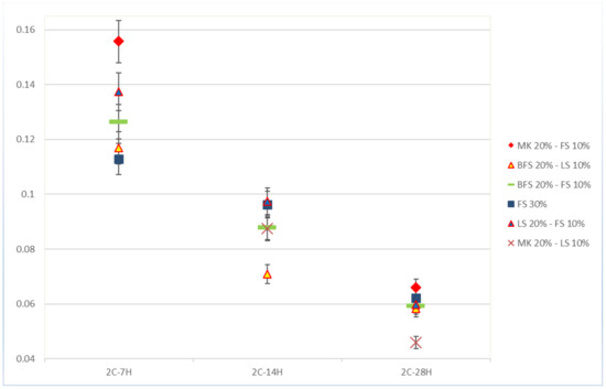 Self-healing kinetics was not constant through time, as illustrated Figure 5, which shows the kinetics of self-healing for specimens sliced after two days. Accordingly, a general decrease in healing kinetics was observed during the 28 days of healing, as observed in previous studies [14]. The results confirmed a higher capacity to form healing products during the first seven days of healing. This could have been a result of the availability of unreacted particles and an abundance of ions due to leaching from the depth of the matrix to the cracks [13,20,21], while, at later ages, the access to the deeper unreacted particles and ions could be denied due to the presence of precipitates and the porosity decrease. The formula with MK20–LS10 showed fast kinetics even after 14 days of healing. Results from the specimens sliced after 28 days of curing showed very low speeds.