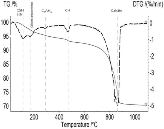 The phases and minerals of all of the formulations were identified and quantified using TGA. Figure 7 depicts a typical TGA result obtained on the sample incorporating 20% of MK and 10% of BFS sliced after two days and healed for 28 days. The weight loss of the homogeneous healing powder at a temperature of around 110 °C can be attributed to the water loss of C-S-H and ettringite, and the one between 140 and 180 °C can be attributed to carboaluminate hydrates [28]. The third drop on the derivative thermogravimetry (DTG) profile at a temperature of about 300 °C can be attributed to the decomposition of C3AH6 [25]. At a temperature of around 450 °C, there was a weight loss assigned to calcium hydroxide; finally, the last peak with a remarkable drop corresponded to the decomposition of calcite at a temperature range from 600 to 880 °C [14]. For all the formulations, a large drop due to calcite decomposition was observable, while the amplitude of the drop due to portlandite evolved with the healing duration. Hence, the TGA results had a good correlation with XRD output and validated its results.