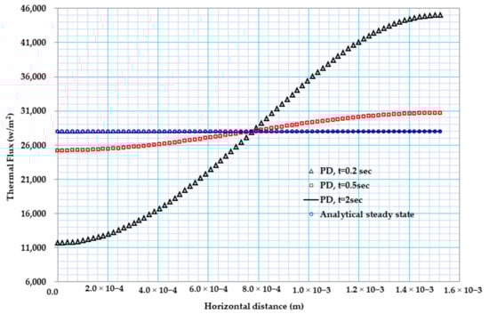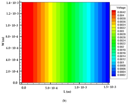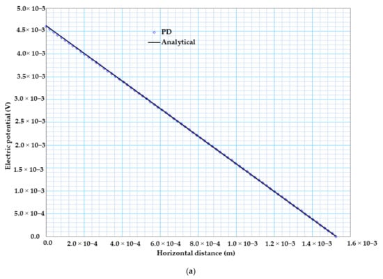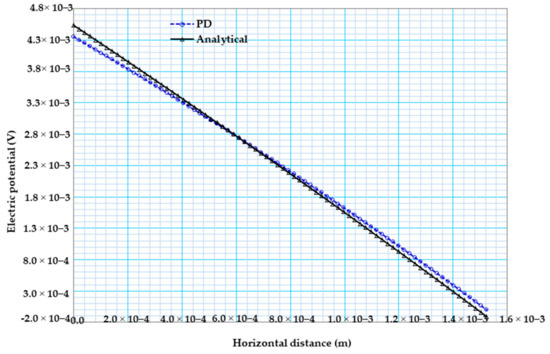 | Horizontal Distance (mm) | Electric Potential (10−3 V) (This Study) | Electric Potential (10−3 V) Ref. [46] | Electric Potential (10−3 V) Ref. [47] | Temperature (K) (This Study) | Temperature (K) Ref. [46] | Temperature (K) Ref. [47] |