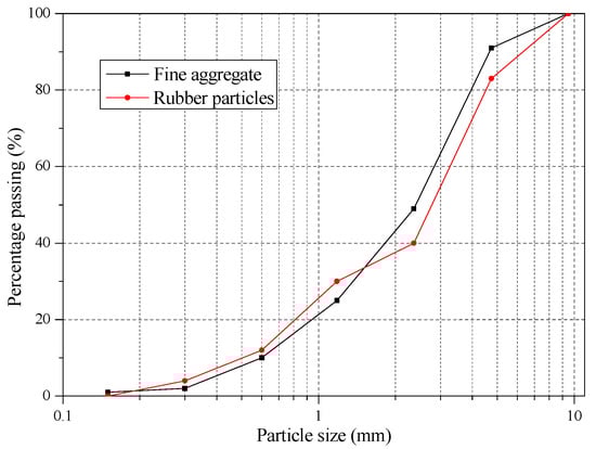Particle size distribution of fine aggregate and rubber particles.
