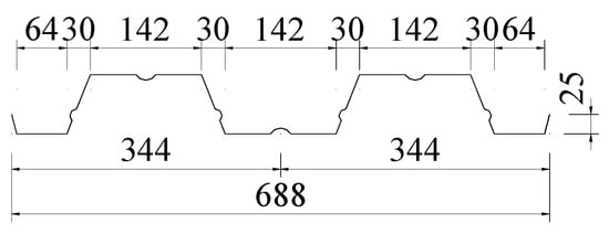 The profiled metal deck used in this study was YX76-344-688 profiled steel sheeting, and the model was DX51D + Z. The mechanical properties of profiled steel sheeting were elastic modulus 2.06 × 105 MPa, yield strength 320 MPa, and tensile strength 405 MPa, respectively. The shape and size of profiled steel sheeting is shown in Figure 2, and the section properties are presented in Table 2. The thickness of the profiled steel sheeting was t = 1.2 mm.