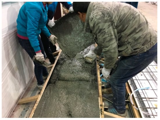 Four composite slabs with two shear span and two types of SCRLC were manufactured, and the flexural performance was investigated through experimental research. The other types of SCRLC affecting the flexural behavior of composites slabs were analyzed by finite element software. Due to the excellent flowability of fresh concrete, the concrete was cast on the profiled steel sheeting without vibration. The manufacturing procedures of composite slabs is shown in Figure 3. After casting, the composite slabs were cured in a wet environment and a lab’s temperature for 28 days. Dimensions of the specimens are provided in Table 4.